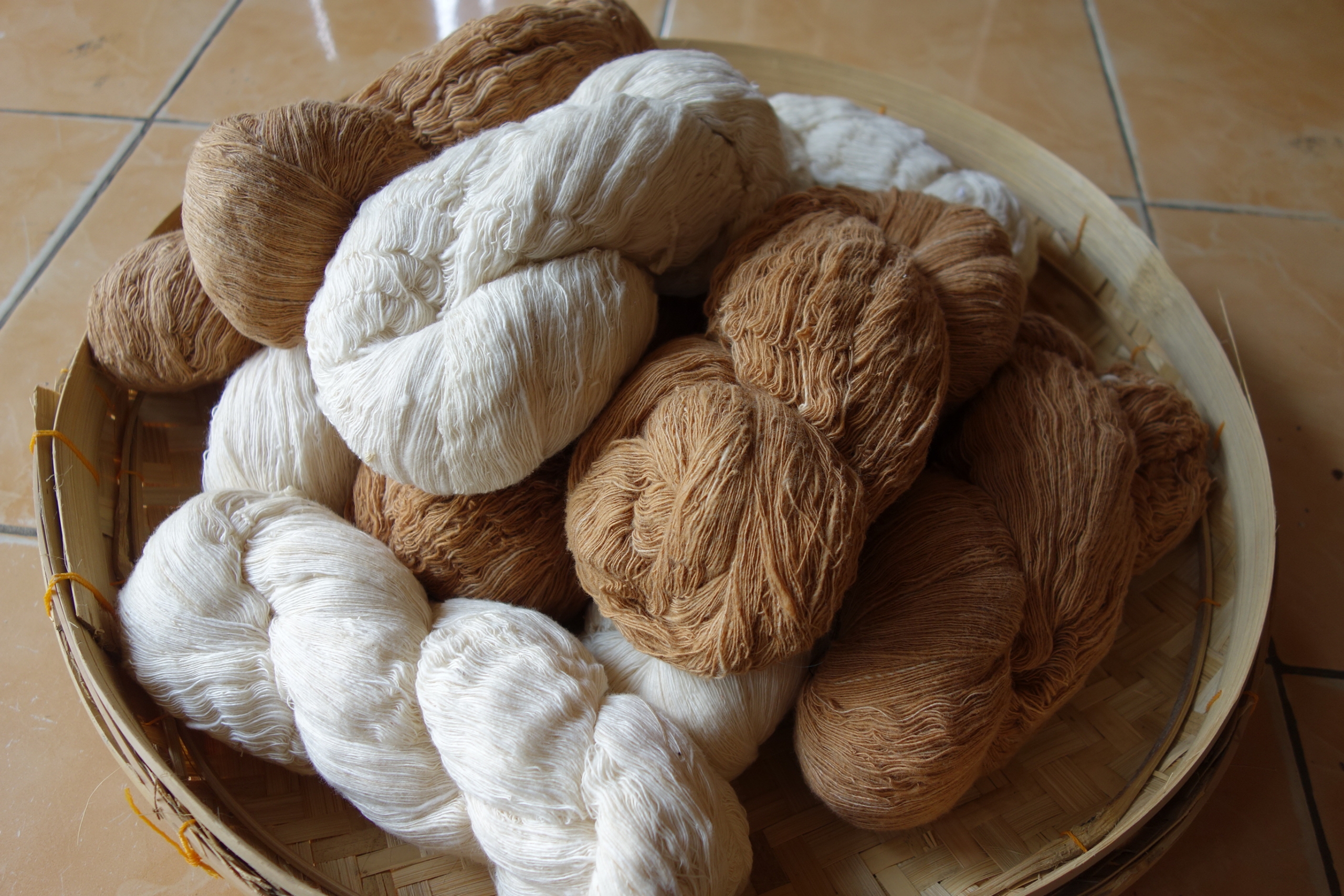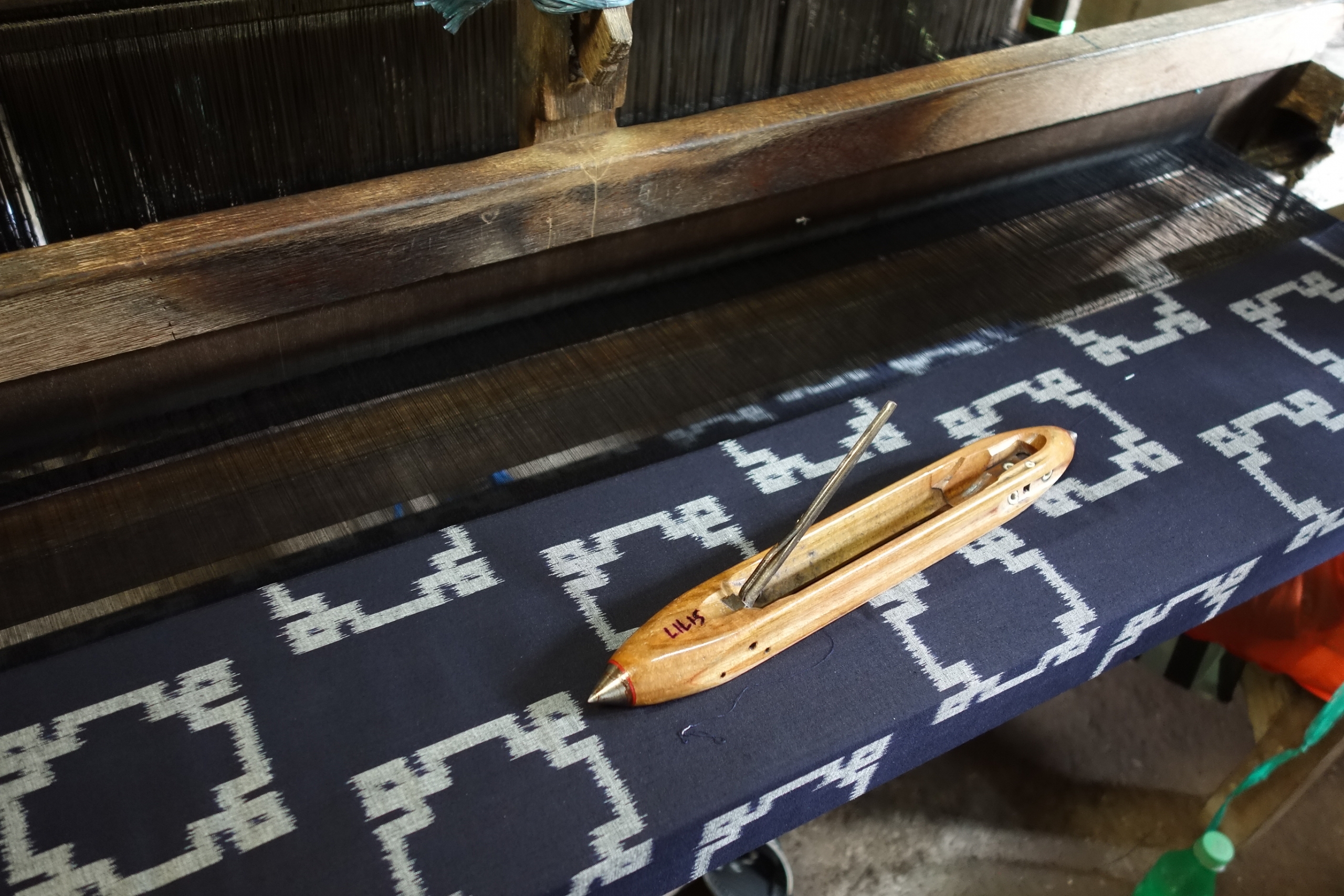 この工房では織りは女性、括りは男性が担当していた。竹の枠にぴっちりと張られた糸を模様通りに括っていく。括った場所は染まらない。何色にも染め分けるから、括る箇所はとても多く、1色染めるたびにどこかをほどき、していくのだろうと思う。アップテンポの曲がラジカセからガンガン流れる作業場だった。