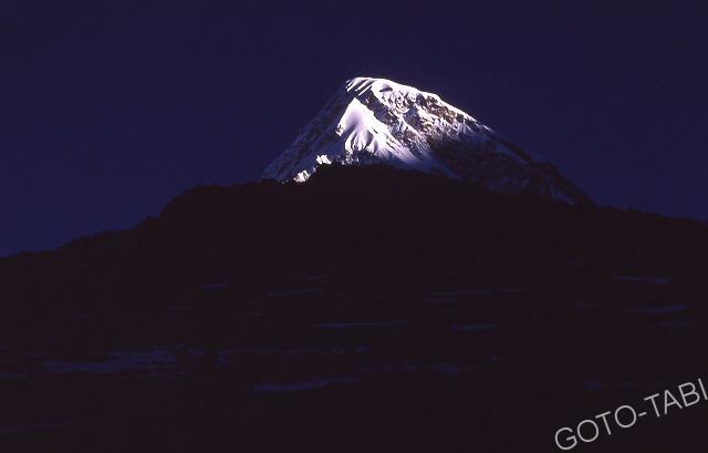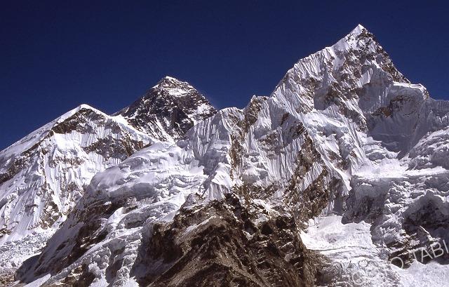 小屋の前からすぐ目の前に、ヌプツェの稜線が始まっている。ヌプツェの向こうに、少し頭を見せているのがエベレストだ。(注・上の写真のことではありません)これからカラ・パタールに登れば、さらに大きく見えるはずだ。ヌプツェ、エベレストと谷をはさむようにして聳えているのがプモ・リで、その手前にある黒い丘がカラ・パタールだ。