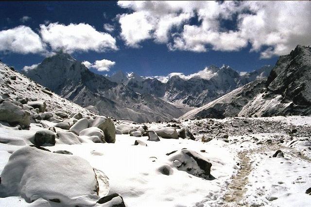 ところどころに、とてつもなく大きな岩が転がっている緩斜面を登って行った。登って行く方向つまりプモ・リの方角に雲が湧き出し、しばらくするうちに山は完全に見えなくなってしまった。が、エベレスト方面は大丈夫だ。じりじりと、頂上を目指した。